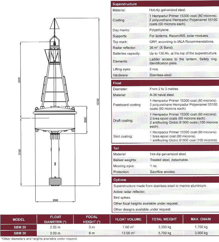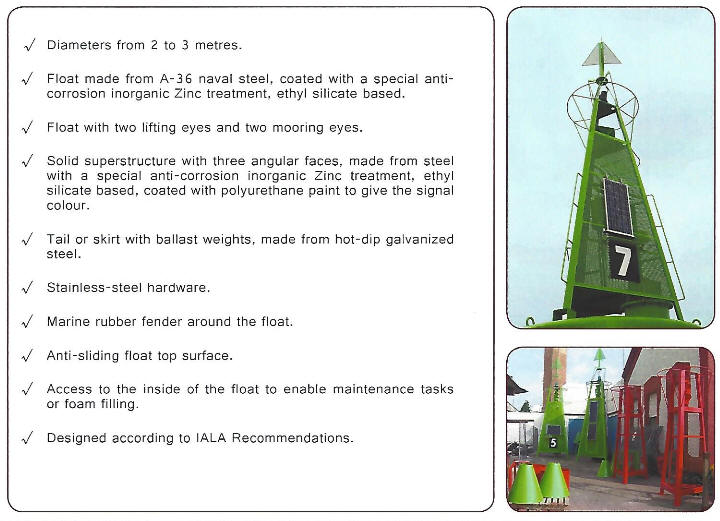 Metallic parts of the buoys (superstructure and tail) are made from hot-dip galvanized steel, and designed to provide