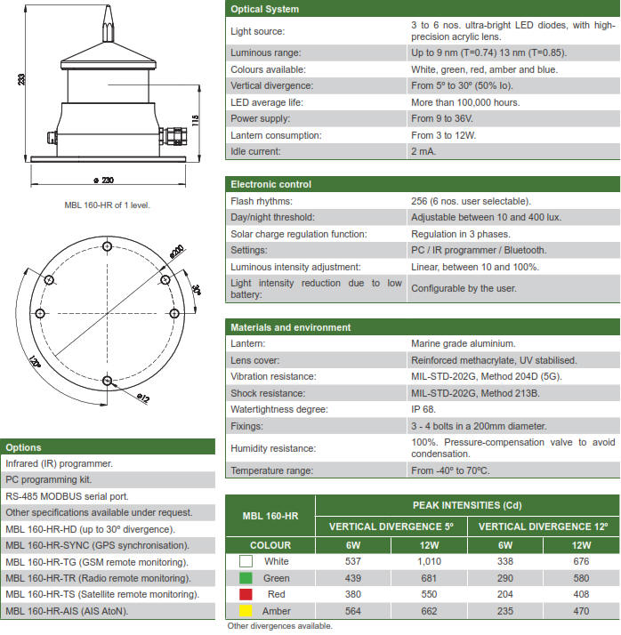 The MBL 160-HR is a LED flashing beacon of short and medium range, with a great optical efficiency and low consumption, fitted