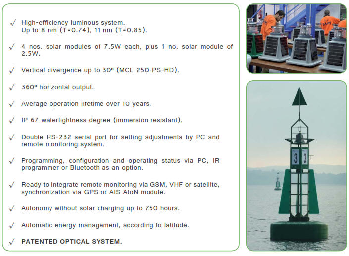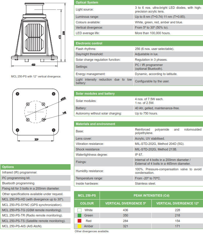 The MCL 250-PS is a compact LED marine lantern of medium range, with built-in solar power, characterized by great optical efficiency and