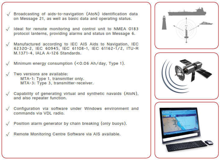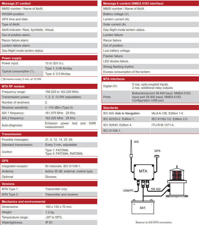 The MTA unit is an AIS AtoN transponder device housed in a IP 67 watertight box, providing automatic information on the GPS