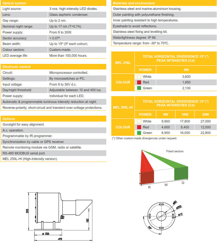 MEL 250L light is designed according to IALA Recommendations and Guidelines, providing complete