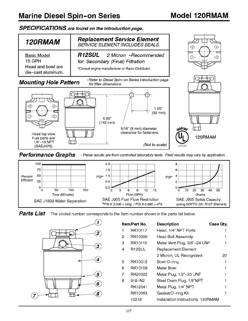 Racor Diesel Spin On Series, Racor 120RMAM, Racor 120 RMAM, fuel filter, fuel conditioning, racor fuel filter, fuel cleaning, diesel fuel filtration, diesel fuel filters, fuel purification,  remove water from fuel, remove particles from fuel, fuel strainer,