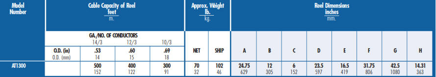 portable cable reel at1300 chart