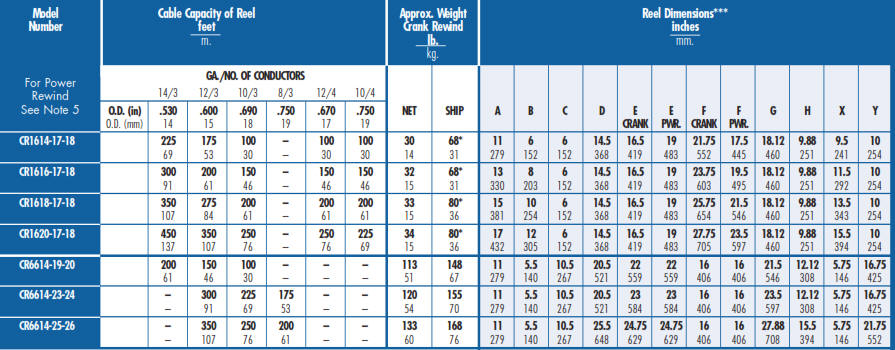 cr series cable reel chart
