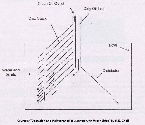 The high speed vertical centrifugal separator consists of a bowl containing a set of discs stacked one on top of the other. The dirty oil flows down the distributor and up through the holes in the discs.