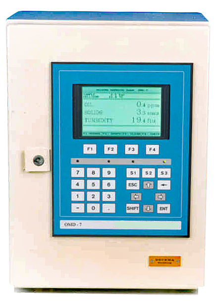 The "OMD-7 Industrial Monitor" is designed to measure the content of Free Oils, Suspended Solids and Turbidity in Water continuously and independently. This design represents the first all new Industrial Monitor capable of distinguishing between the different characteristics of Oil particles, Solid particles and Water Turbidity on a continuous basis. The OMD-7 comprises a compact Measuring Cell, Monitor with integral Computer Unit and Monochrome Alphanumeric Display as well as our proven Sample Conditioning Unit (SCU) for sample processing.