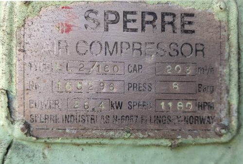 We have used Sperre LL2/160 Air Compressor, available for immediate sale.