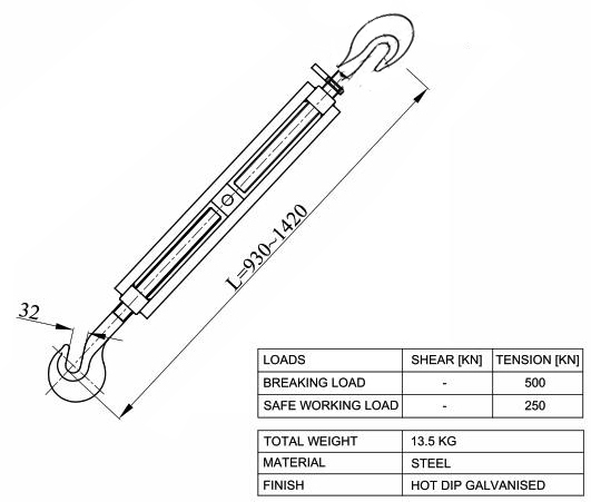 Ocean Container Turnbuckle - Hook to Hook - Open Body
