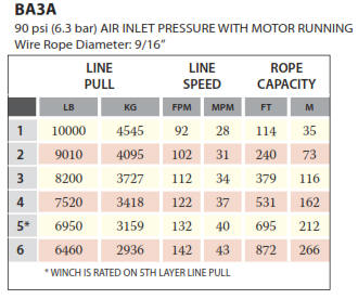Model Line Pull Line Speed AVG. Air Consumption At Rated Load Max. Stall Pull 1st layer Pipe Inlet Size Hose Size