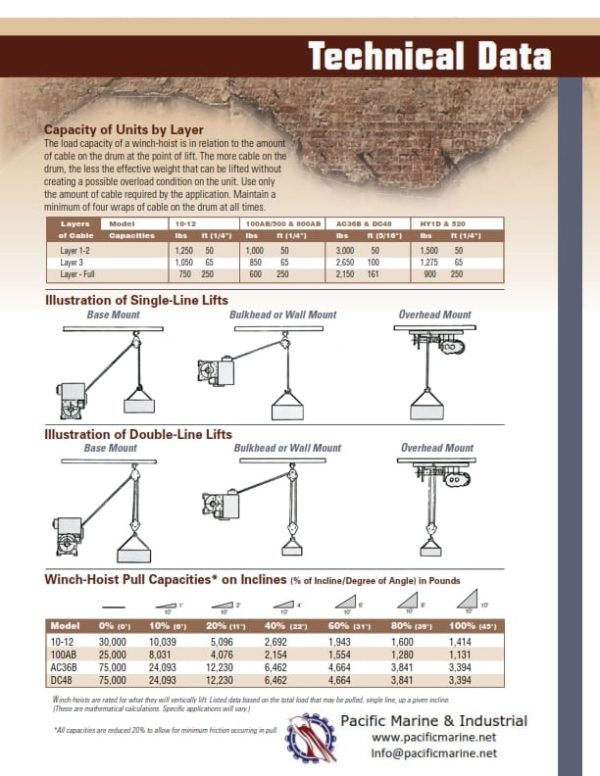 • 850 lbs – 3 layers of cable (65' of 1/4" cable)