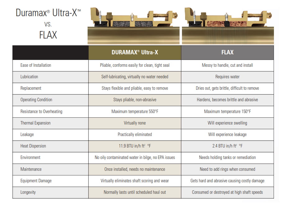 Because of its composition and design it lasts more than 5 times longer and outperforms all flax and PTFE packing in marine stern tube, rudder and bulkhead applications.